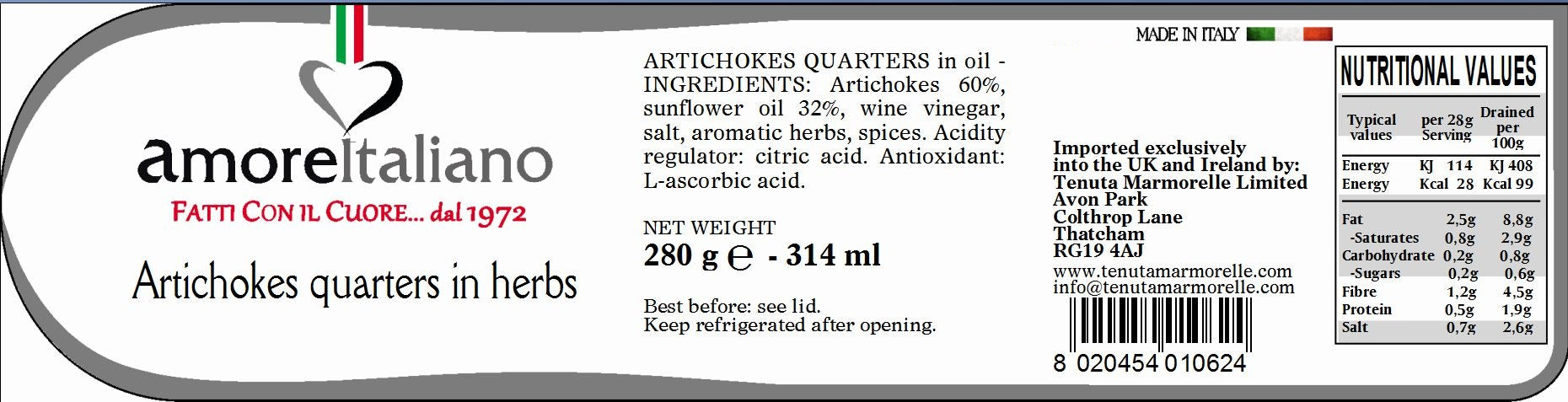 Ingredients: artichokes 60%, sunflower oil 32%, wine vinegar, salt, aromatic herbs, spices acidity regulator: citric acid. antioxidant: L-ascorbic acid.