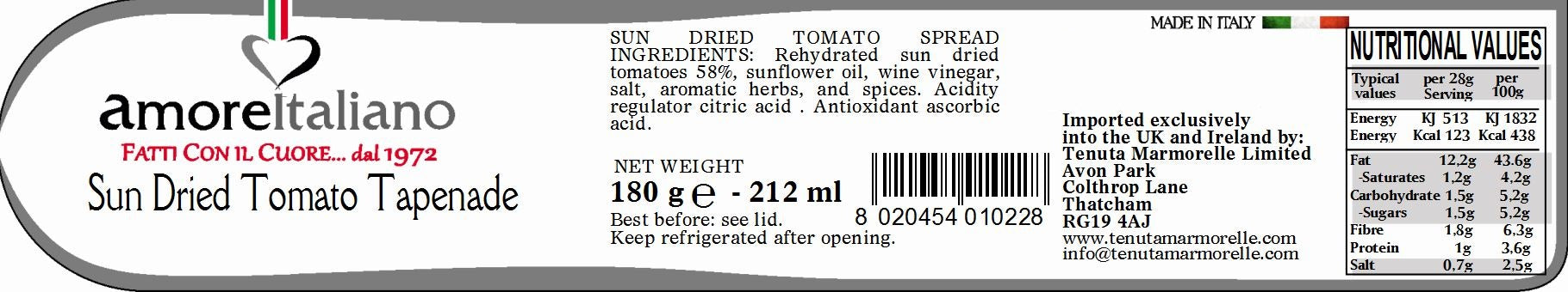 Ingredients: Rehydrated sundried tomatoes 58%, sunflower oil, wine vinegar, salt, aromatic herbs, spices. Acidity regulator: citric acid. Antioxidant: L- ascorbic acid.